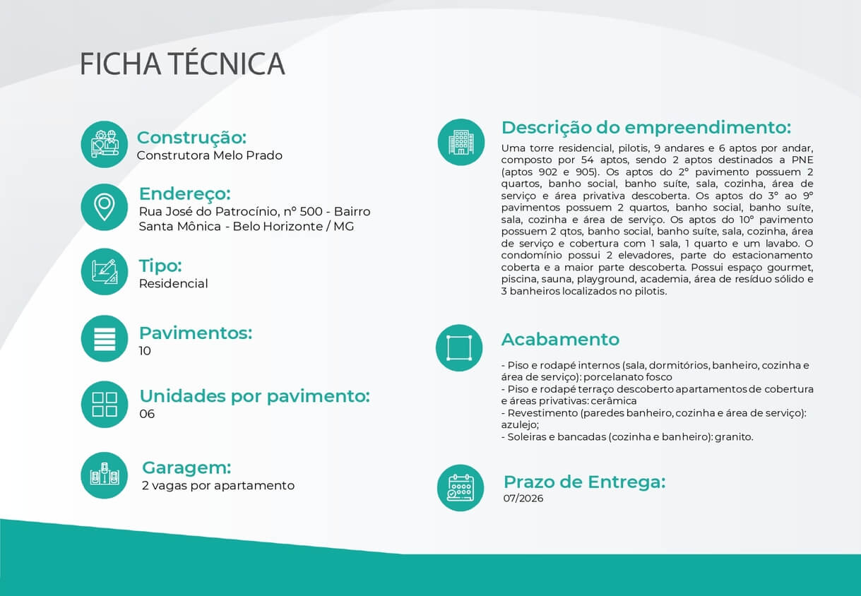 Construtora: Melo Prado. Endereço: Rua José do Patrocínio, Santa Mônica, Belo Horizonte – MG. Tipologias: 2 Quartos com Suíte e Cobertura. Entrega prevista para junho de 2026.